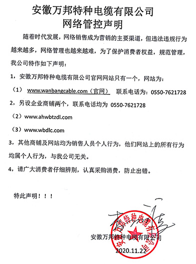 鄭重聲明:安徽萬邦特種電纜有限公司官方網站為:www_wanbangcable_com.w499.cn,除此之外無任何子網站或合作網站,其余均為假冒偽劣。電話:0550-7621728 13485756353 地 址:安徽省天長市滁州高新技術產業開發區經四路29號